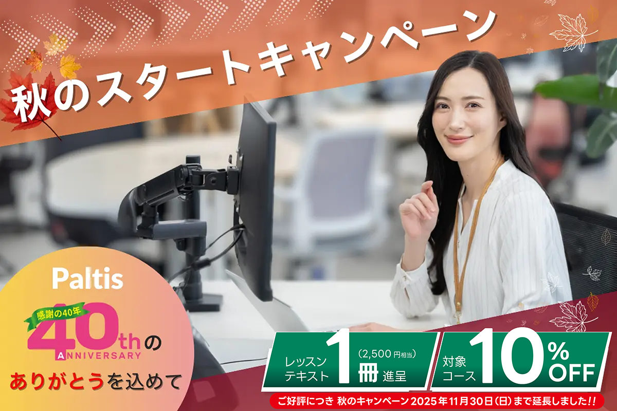 - 皆様のおかげで40年。札幌のパソコンスクールパルティスは、たくさんの方とともに学び、成長してきました。北海道の皆さまへの感謝の気持ちも込めて、秋のスタートキャンペーンを開催!初心者の方も、スキルアップを目指す方も、お得に学べるこの機会を是非ご活用ください。